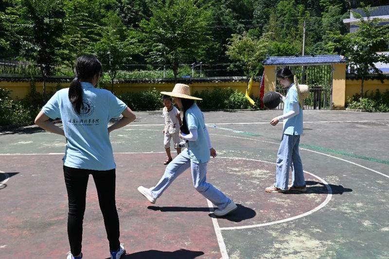 图为实践团成员们向孩子展示三步上篮