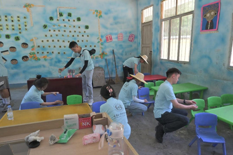 除了破冰活动,实践团成员们还将目光聚焦在改善教学环境上。原计划作为支教地点的教室,因与平时教学规模不同以及处于放假期间,教室比较脏乱,缺少桌凳。为了支教工作有序展开,实践团成员们组织了一场大扫除活动。