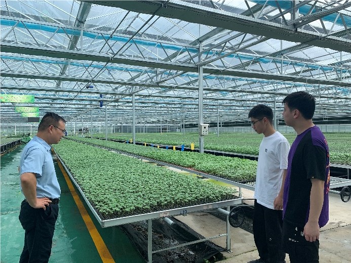 随后,团队来到了苗乐科技有限公司。在这里,团队成员了解了滨海现代农业产业园区规划,观看学习重点项目规划区域图,深入认识园区发展布局。此外,走访大棚智能化育苗工厂,技术人员解释道,该基地年均培育各类种苗1.5亿株,种类以西瓜为主。其中的七成为本地订单。育苗具有苗壮、抗病性好的优点,服务于周边各个县区,助力周边农户增收。