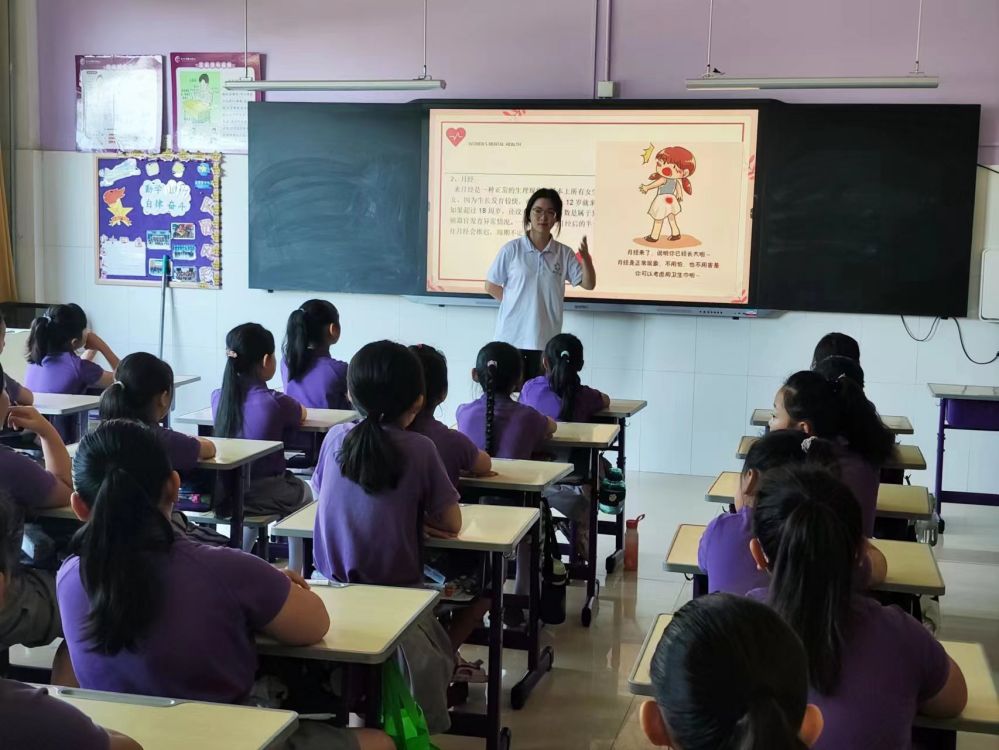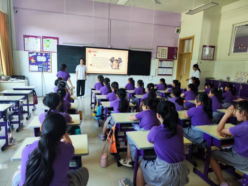 2023年8月4日上午,青州市南湖学校夏令营二期全体女生在支教老师的带领下聚集到夏令营三班参加由支教队长刘焕焕老师主讲的《认识隐私部位 学会自我保护》女生安全教育专题课程。
