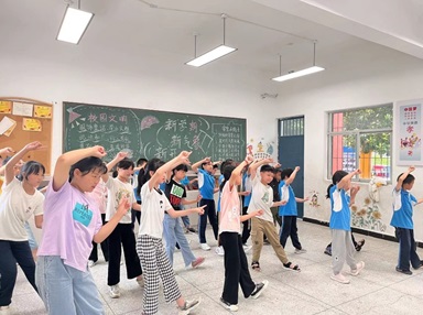 图中为志愿者们带领孩子们在舞蹈课上学习舞蹈,动作标准,整齐划一。(陈佳敏 摄)