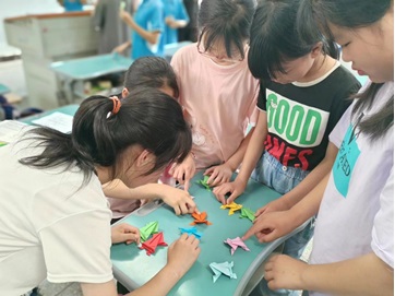 图为志愿者老师在手工课上带领孩子们折纸青蛙。(袁晨曦 摄)