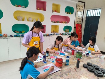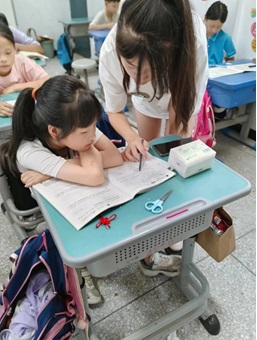 图为志愿者老师在美术课上与孩子们一齐创作作品。(廖垣樯 摄)