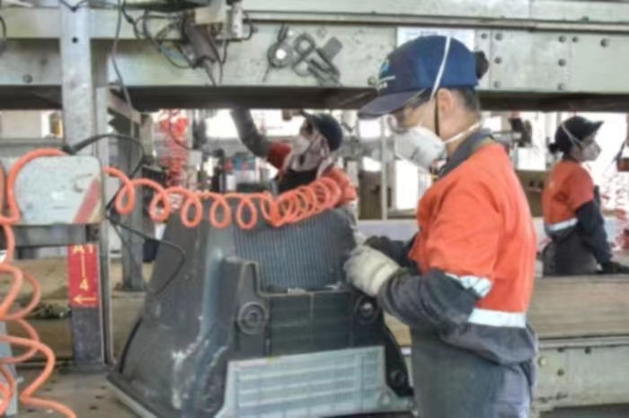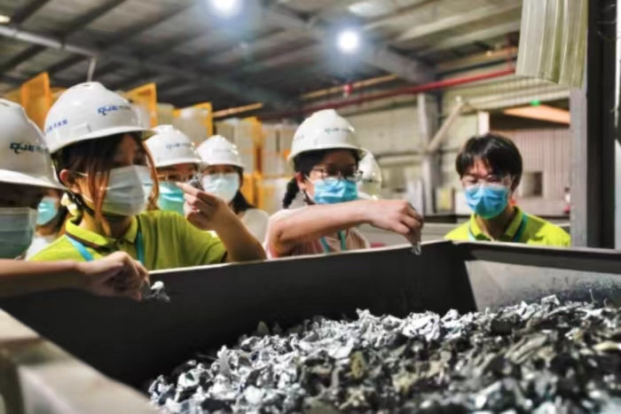 在做好安全防护后,实践队队员跟随讲解员来到处理厂的工作车间,讲解员介绍道,公司的流水线生产严格遵循各项规定,以绿色产业和低碳技术为基础进行运作,且严格把控水、电和煤的使用,高效回收废弃电器电子产品,提高废弃物综合利用率。