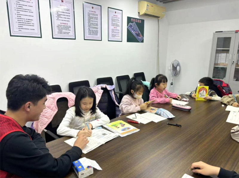 图为实践团成员在辅导学生们的寒假作业