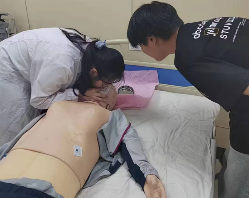 在操作环节,医院为大学生准备了模拟假人,大学生纷纷开始实践操作。 同时作为小老师。 向身边的人介绍心肺复苏的全过程以及操作具体细节,他们的操作愈发熟练。有节奏的按压假人的胸部身体笔直,眼神专注。旁边的学习者也是积极学习相关知识认真观看充满热情。学习着关于胸部按压,人工呼吸以及呼吸道异物处理和判断被抢救人的生理状态作出相应措施的方法。最终不但增强了大学生和学习者的实践操作能力,也使人更加深刻明白了急救工作的重要性,有利于在危急时刻挽救更多生命,取得一线生机。