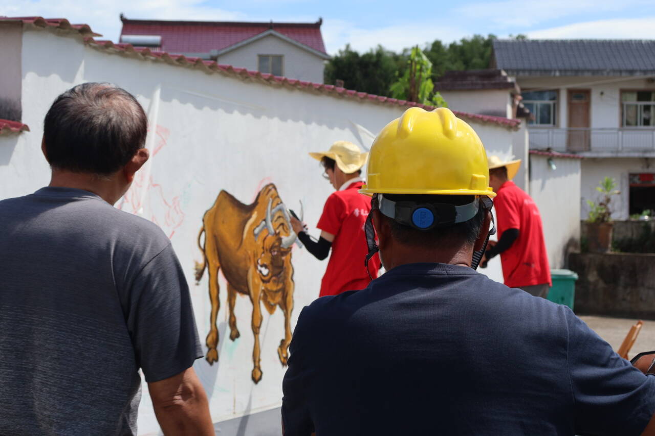 团队整体经过中期总结会议,对接下来的实践内容和规划有了更加清晰的认识。团队成员邓献泽说:“路虽远,行则将至。事虽难,作则必成。作为一个美术生,我们只是做了我们想做,能做,应该做的。对于团队目前取得的进度,是大家一起努力的结果”。随着绘画场景的逐渐延伸,越来越接近村民的民居,爷爷奶奶都带着自己的小孩围观我们的创作。团队成员决定将这样一副和美的画面搬上墙面。