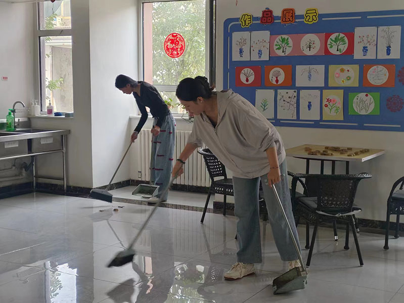 打扫卫生和整理床铺的工作也在实践过程中进行得如火如荼。志愿者们分工合作,有的仔细擦拭家具和窗户,有的认真清扫地面,不放过任何一个角落。在整理床铺时,志云这们细心地铺平床单,把被子叠得整整齐齐,还为老人们更换了干净的枕套。经过一番努力,老人们的居住环境变得更加整洁、舒适。