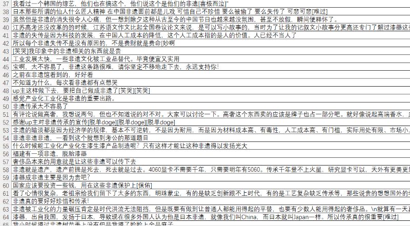 我们选择了b站上一名知名非遗up主(南翔……)的非遗传承视频爬取评论,经过一段时间的努力,爬虫程序成功获取了大量的数据。