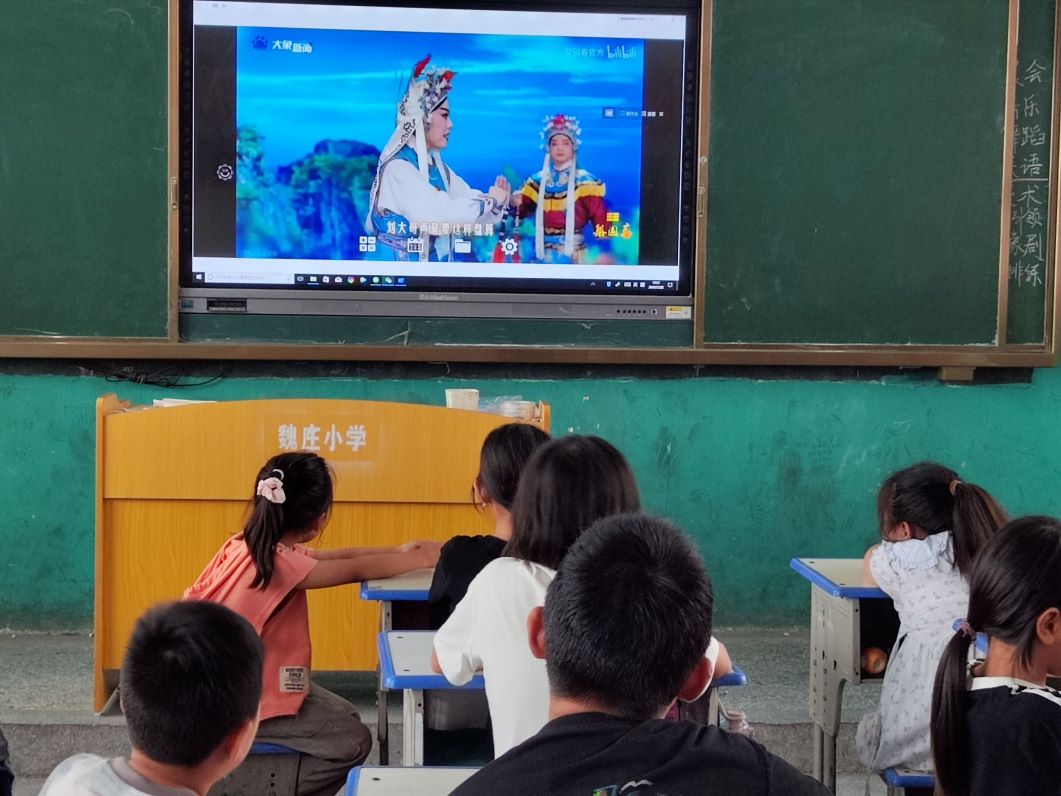 在系统学习豫剧的基本知识之后,孩子们对豫剧文化有了一个初步的认识。大家的眼神中充满了兴奋,意外于在自己最为亲切的土地上,竟能生长出这样丰富多彩的文化宝藏。“老师老师,那豫剧唱起来是什么样的啊?”有同学好奇地问道。紧接着,支教团成员便带领大家一同观赏了著名的豫剧选段《花木兰》。在讲解过后,观赏的形式能让孩子们更直观,更全面地感受豫剧。孩子们沉浸地观看,感受着剧中高亢明亮的唱腔,生动传神的表演以及简练而有深意的语言和唱词。《花木兰》这一选段,既展现了慷慨激昂的战斗场面,也展现了柔情似水的儿女情长,充分展现了豫剧唱腔的丰富性和表现力。此外,花木兰这一人物忠孝、勇敢、智慧和温柔等性格特征在剧中被刻画得淋漓尽致,深深感染着孩子们。