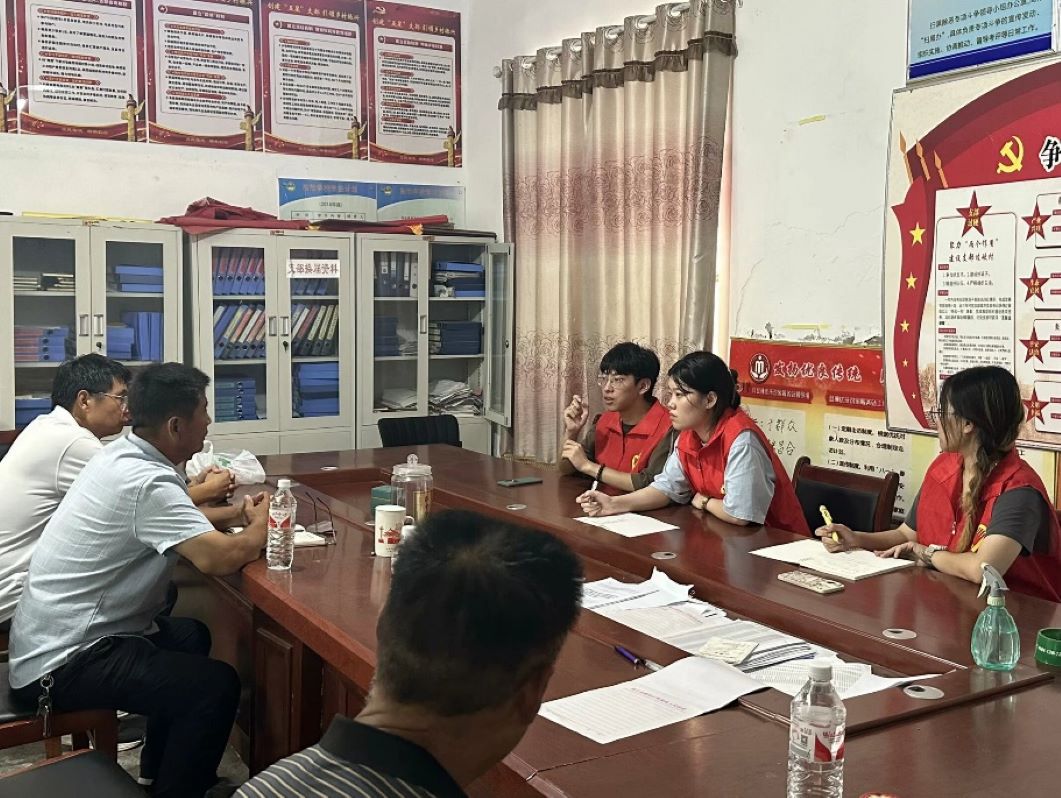 习总书记说过“重农固本是安民之基、治国之要”随着国家对乡村振兴战略的深入实施,大学生作为新时代的青年力量,纷纷响应号召,将所学知识与实践相结合,积极投身到广袤的农村大地中去。8月1日,来自河海大学的“涓泽润豫,碳索未来”千乡万村环保科普小分队深入河南省商丘市睢阳区宋集镇小邓庄邓楼寨村村委会,与村干部进行了深入的交流与探讨,共同为乡村振兴与绿色发展献计献策。村支部党委书记陈书记对本次实践活动表现出大力支持,小分队成员们就教育资源、农业发展、环境保护等多个方面向村干部展开咨询讨论。