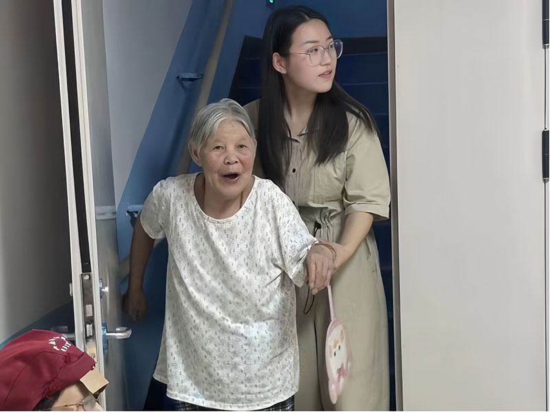 实践团成员注意到有老人下楼上楼腿脚行动不便,实践团成员便扶着老人从楼上走下来,确保与老人步伐相一致,时刻观察着老人的身体状况,老人享受贴心服务的同时,脸上露出欣慰的笑容,整个房间萦绕着温馨的气氛,老人的脸上洋溢的笑容也让实践团成员心里暖洋洋的。