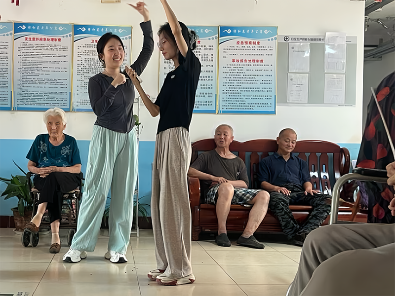 实践活动的最后一天,在老人的邀请下,走进了他们的娱乐场所,为老人演唱了几首她们年代爱听的歌曲以及集体舞蹈等节目,也与老人进行了“歌曲互动”让他们感受青少年的朝气和社会的温暖,这场温馨的文艺汇演更拉进了实践团成员与老人们之间的距离。
