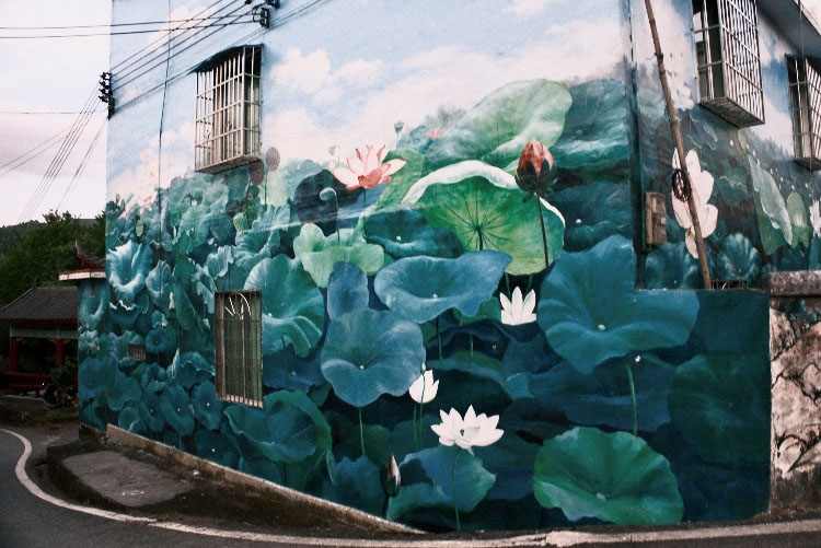 漫步蒙峒古村,感受独特、浪漫的民族气息。从拱形大门走进蒙峒古村,可见五颜六色的油彩壁画错落在灰白砖制建筑其间。在坡道拐角处,荷塘莲叶簇拥,三两朵莲花亭亭玉立,蓝天上白云如水墨般向四处晕染,让行人置身浓墨重彩的画卷中。这些墙绘利用艺术表达,将壮族的传统文化跃然壁上,使行人感受到独特的美丽。