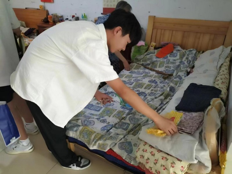 清晨,志愿者们早早地来到养老院的卧室,开始为老人们叠被子。他们按照统一的标准和要求,仔细地整理床铺,确保每个被子都叠得整整齐齐、美观大方。同时,他们还帮助老人挪动床位、整理衣物,尽量让老人们感受到家的温馨与舒适。