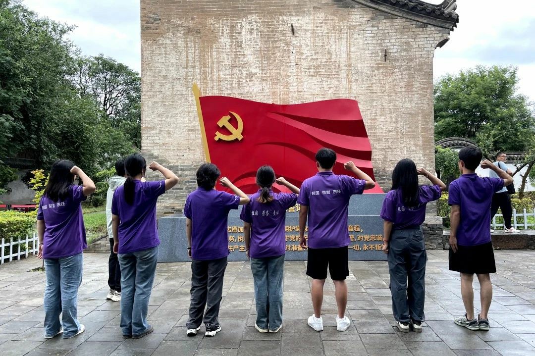 在探访了这个党史教育基地之后,实践小队中的预备党员同志,自发地组织起来,重温了入党誓词。