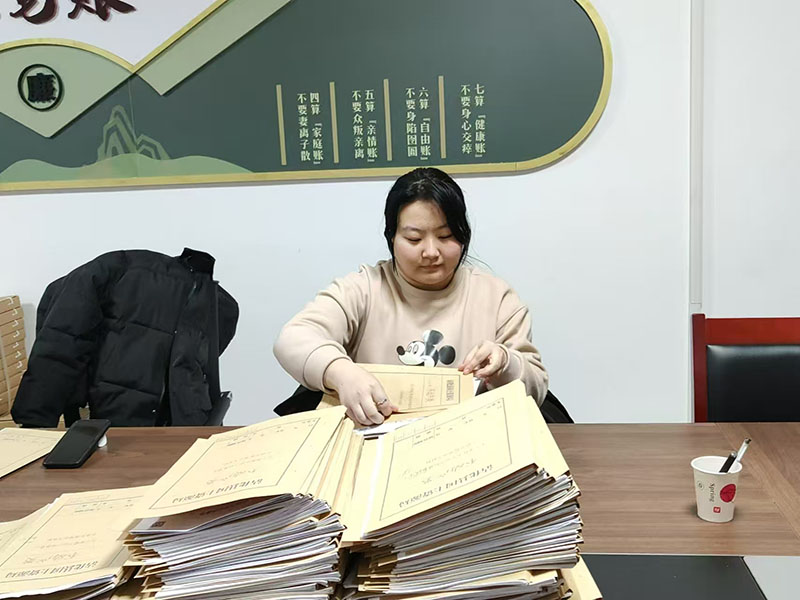 图为社会实践团成员丁晨曦服务房地产整理文件资料的工作