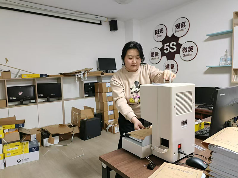 图为社会实践团成员丁晨曦服务房地产文件资料装订的工作