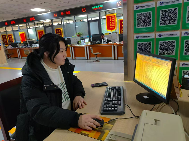 图为社会实践团成员丁晨曦服务房地产核对电脑文件信息的工作