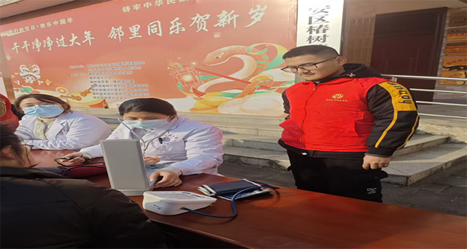 在社区的健康服务站里,血压测量活动正如火如荼地开展着。医生们为社区的老年人提供专业的血压测量服务。志愿者身着整齐的红色志愿者马甲,耐心地引导老人们有序排队,依次就座。在测量过程中,志愿者们动作娴熟,神情专注,仔细地为每一位老人绑好血压计,认真记录下测量结果。测量结束后,医生们还会根据血压数据,结合老年人的身体状况,给出合理的健康建议,提醒老人们在寒冷的冬季注意保暖、合理饮食、适量运动,并定期进行健康检查。志愿者们的贴心服务让老人们倍感温暖,老人们虽然没有言语表达,但他们脸上洋溢的笑容,已然是对志愿者们最好的认可和赞扬。