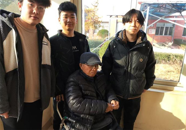 此图为“夕阳信使”实践团成员张景昊、许云恺、李永生陪老人聊天