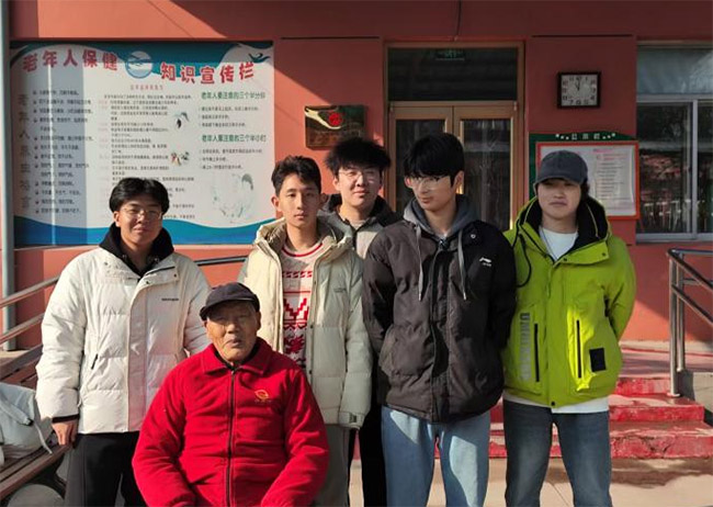 此图为“夕阳信使”实践团成员刘书贵、杨靖煜、张景昊、王玉琥、王一名和爷爷聊天晒太阳的留影