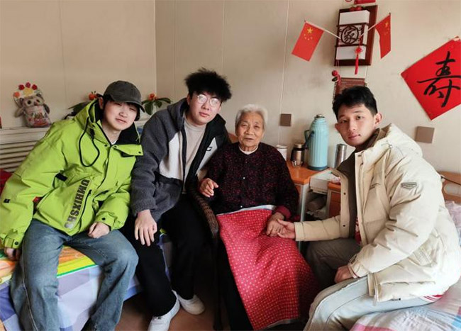 此图为“夕阳信使”实践团王一名、杨靖煜、张景昊陪高龄奶奶互动聊天