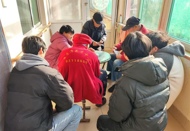 此图为“夕阳信使”实践团王玉琥、张景昊、李永生一起陪老人们聊够级打牌