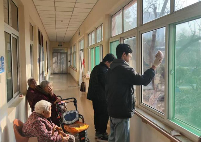 此图为“夕阳信使”实践团成员王玉琥、许云恺打扫卫生擦拭窗户