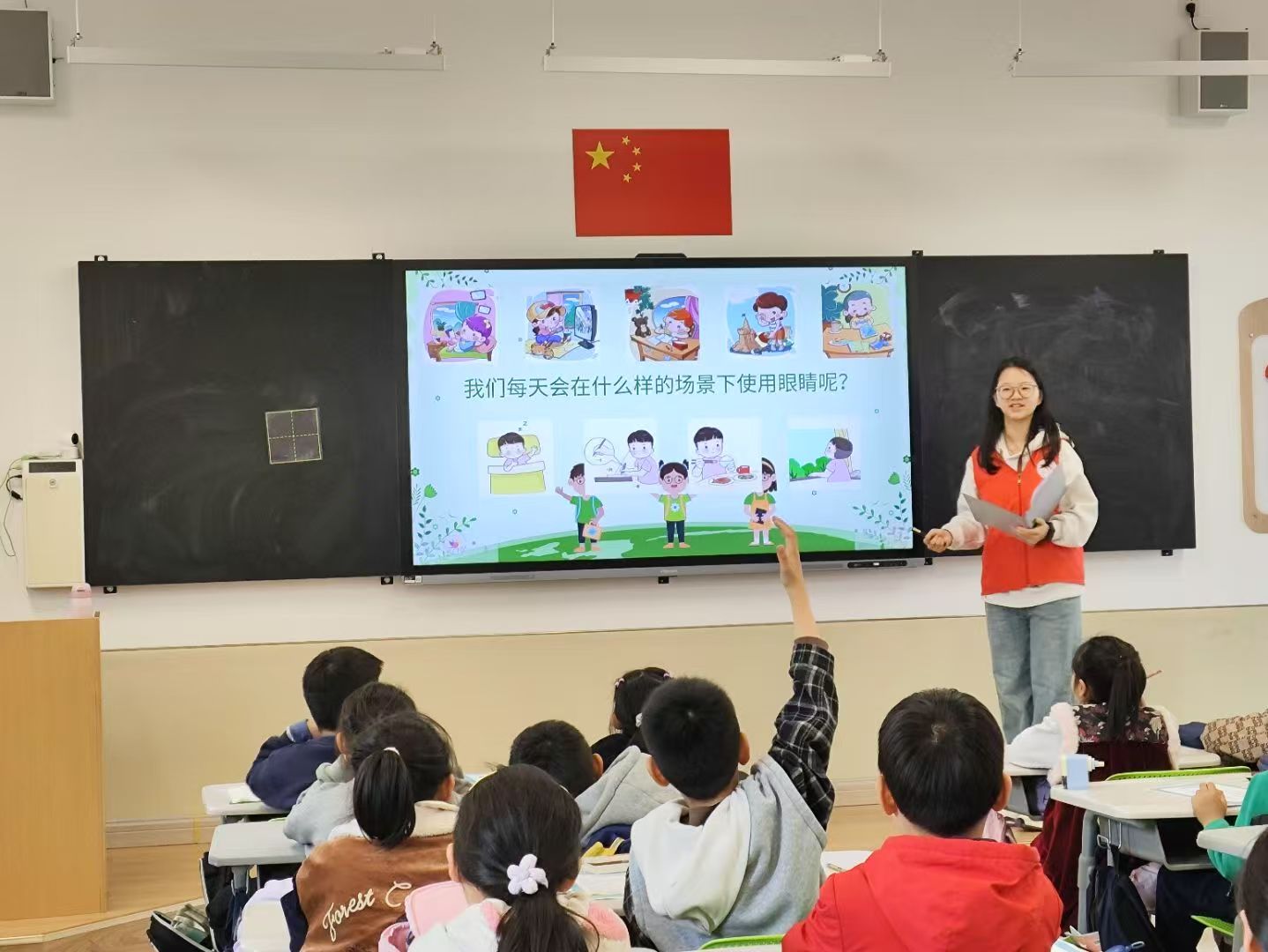 在探索眼部奥秘的过程中,志愿者们以一组生动的照片作为课堂导入,展示了不当用眼习惯的危害,并告诫孩子们“脏手不摸眼”。随后,志愿者简明扼要地介绍了眼睛的基本结构,并提出了一道引人深思的问题:“为何电影中的角色能通过眼神解锁?”此言一出,立刻引起了学生们热烈的讨论。紧接着,志愿者们对近视、远视以及红眼病等日常生活中常见的眼科疾病进行了科普介绍。他们巧妙地运用活泼可爱的卡通形象与妙趣横生的语言解说相结合的方式,营造出轻松愉快的学习氛围,在欢声笑语中传播着爱护眼睛的知识。最后的实验环节更是将课堂气氛推向了高潮。