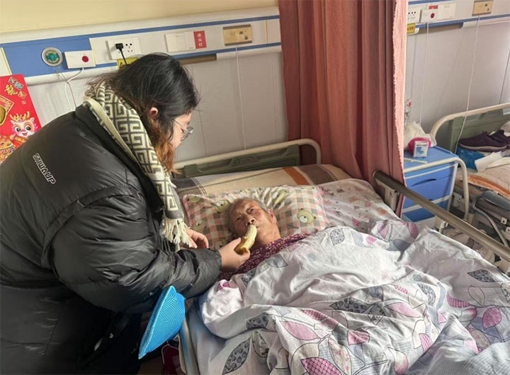 实践活动不仅关注到能自理的老人,也特别关心行动不便的老人。在老年公寓的病房内,一位实践团成员正耐心地为卧床的老人喂食,手中的香蕉已经剥好,小心翼翼地送到老人口中。老人安静地躺在床上,床头摆放着几张红色的福字装饰,显得格外温馨。这一幕,不仅展现了实践者的细致与耐心,也让整个病房都充满了温暖的氛围。