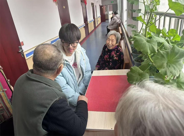 在公寓宽敞明亮的走廊里,几位实践团成员正陪伴着老人聊天,温暖的阳光透过窗户洒在他们身上,映照出和谐的画面。一位身穿黑色长款羽绒服的女生轻声与老人交谈,仔细倾听他们的故事,不时俯身调整助行器的位置,关切之情溢于言表。而在另一边,几位老人围坐在桌前,手中拿着扑克牌,与年轻的实践者相谈甚欢,偶尔传出一阵欢声笑语,老人脸上的笑容仿佛让时间回到了他们年轻的岁月。