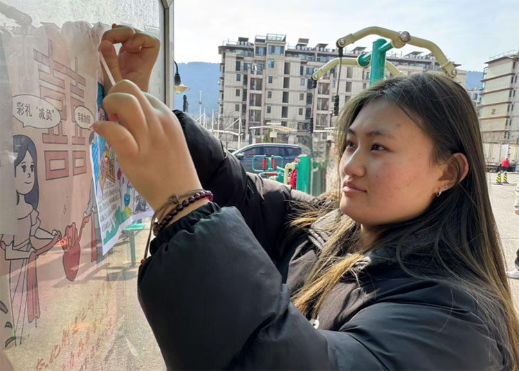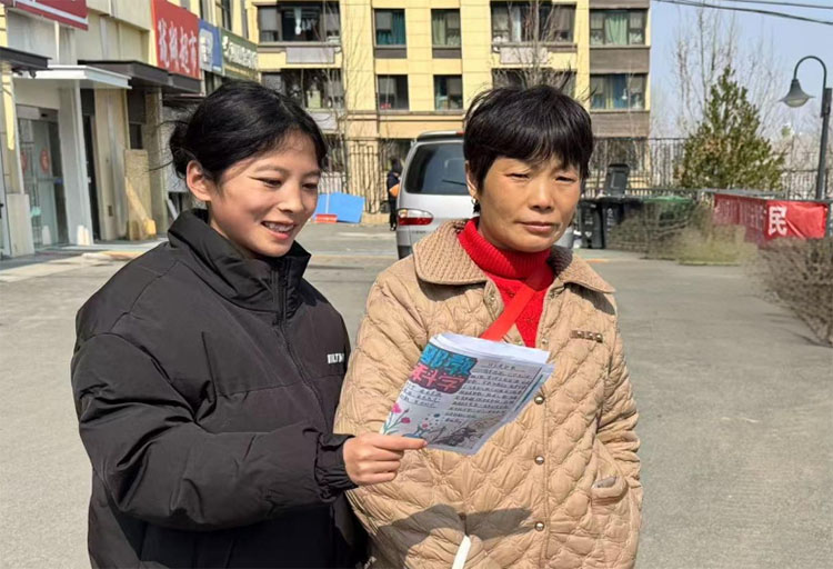 (图为实践团成员林佳佳在社区分发宣传资料)