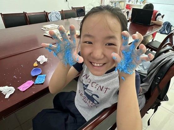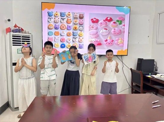 泥捏乾坤扇绘春,笔裁锦绣落童真。除了宣传非遗文化,团队成员为了拉近和孩子们的距离,还开展了许多趣味的手工活动,捏橡皮泥,制作纸扇以及画简笔画。通过揉、捏、塑形,一个个充满童趣的造型在孩子们的手中出现,通过剪裁、绘画、组装,完成了简易纸扇的制作。活动结束后,团队成员与孩子们共同参与合影拍摄。孩子们手持活动中完成的橡皮泥作品、纸扇及绘画习作,与成员们并肩而立。镜头下定格了双方的融洽瞬间,为此次实践活动留存下直观而珍贵的影像记忆。