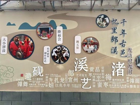 踏入一里巷,长约百米的“千年古邑 魅力非遗”文化墙率先映入眼帘,其以立体“文化图鉴”之姿,铺展郎溪非遗传承脉络。墙面上,姚村云舞追溯至明代,跳五猖将士们刚劲舞姿、神秘脸谱的符号;侯村蜜枣制作技艺里,大小锣鼓传承谱系。十余项非遗项目借由百组简洁文字、两百余张珍贵影像,勾勒出郎溪自东晋建县以来,从农耕社会民俗滥觞到当代文化振兴的完整文化肌理。