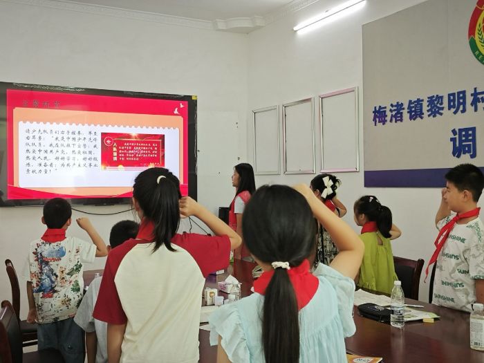 “我热爱中国共产党,热爱祖国,热爱人民……”在队旗下,全体学生高举右拳庄严宣誓,铿锵誓言回荡在教室中。一名参与活动的孩子说:“我要像党员叔叔阿姨一样,长大为人民服务!”