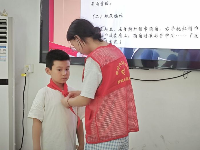 团队成员以“小英雄王二小”“长征路上的红小丫”等故事,阐释“少年强则国强”的深刻意义。随后,队员们手把手教孩子们系红领巾:“领巾披上肩,左尖压右尖,右尖绕一圈,圈里抽出尖。”反复练习后,孩子们胸前的红领巾整齐飘扬,映衬着稚嫩而坚定的脸庞。