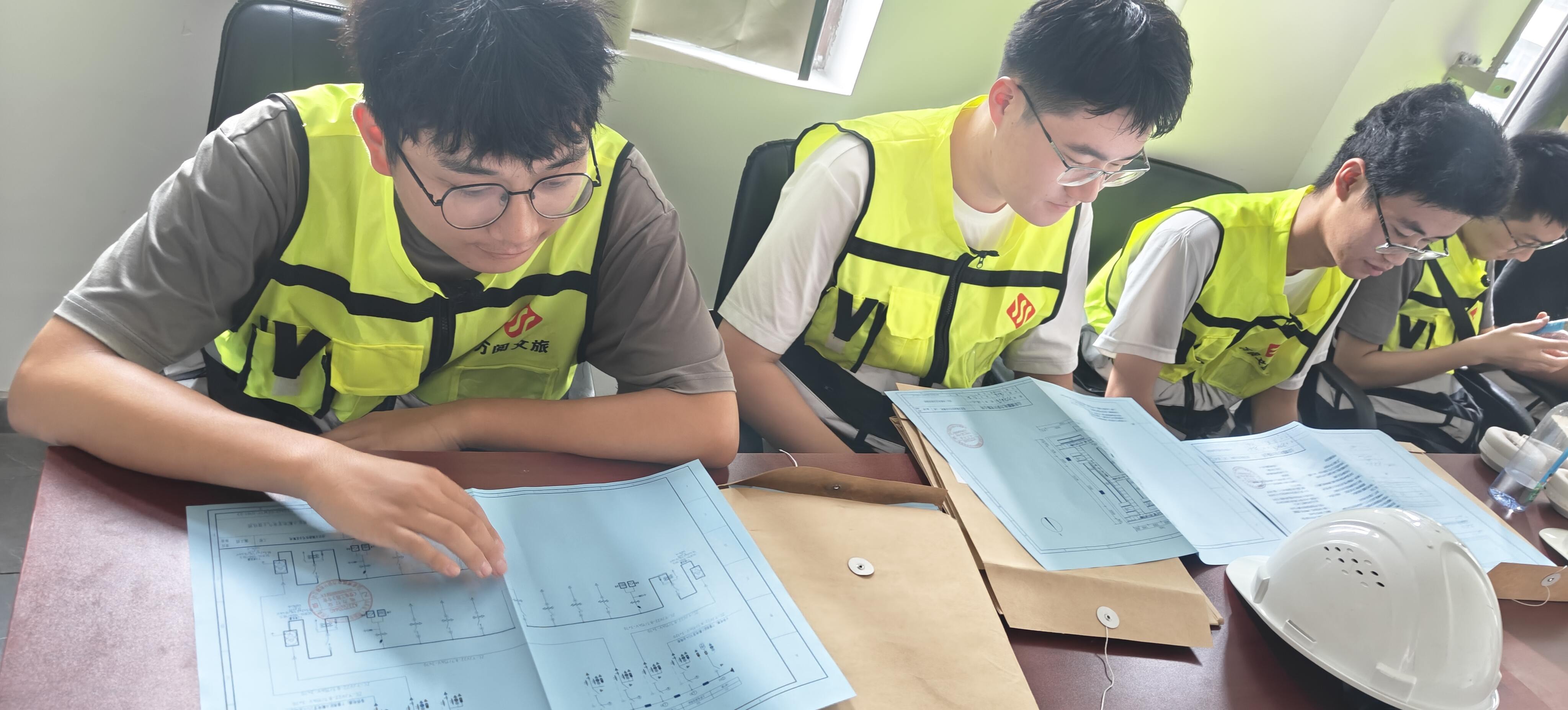图纸研析环节,实践队成员对照项目配电室平面布置图、高低压系统单线图、二次回路原理图等技术资料,逐层梳理供电链路逻辑与保护配置策略。工程师就图纸符号释义、容量核算依据、电缆选型标准等内容进行延伸解读,引导队员将理论范式与工程实景相互印证。