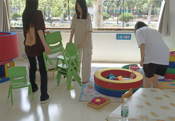 在一间充满生活气息的兴趣活动室内,阳光透过窗户轻柔地洒落在地上。社会实践的成员们正忙碌且有序地整理着各种物品。室内的椅子横七竖八地摆放着,有的椅脚还相互交错,像是在诉说着之前活动的热闹。还有一些手工制作的半成品,显得杂乱无章。成员们各自分工明确,有的成员弯下腰,双手紧紧握住椅子的椅背,小心翼翼地将椅子扶正,然后整齐地排列在墙边;有的成员则耐心地将散落在地上的道具一件件拾起,仔细分类后放进相应的箱子里。