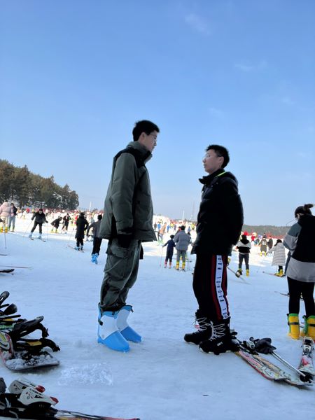 随后小组成员来到了雪场继续考察和体验。雪场里配备了一百多个教练员,提供有偿滑雪教学服务。为了自身和他人的安全,进入雪场的大门口有喇叭重复呼吁初学者聘请教练。教练主要负责照顾学员滑行过程中的安全和初级的滑行技巧。在团队成员与教练的交谈中,得知教练大多数来自东北,趁着年前还没回老家来这里做兼职。教练也透露今年来游玩的游客人数特别多,有很大一部分都是初学者,之前没有滑雪的经历,是今年受到冬奥会的影响才来体验滑雪项目。大部分游客也很乐意请教练来提高自己的滑雪技术。