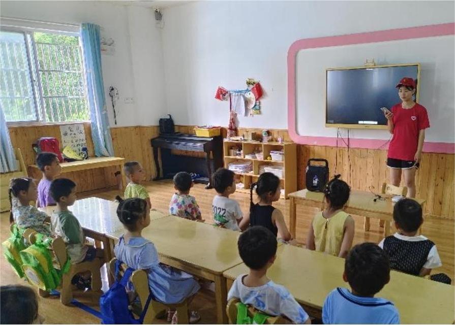 图为实践队员向黄墩镇晨光幼儿园师生介绍圆梦项目 通讯员 董子文 供图