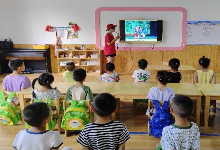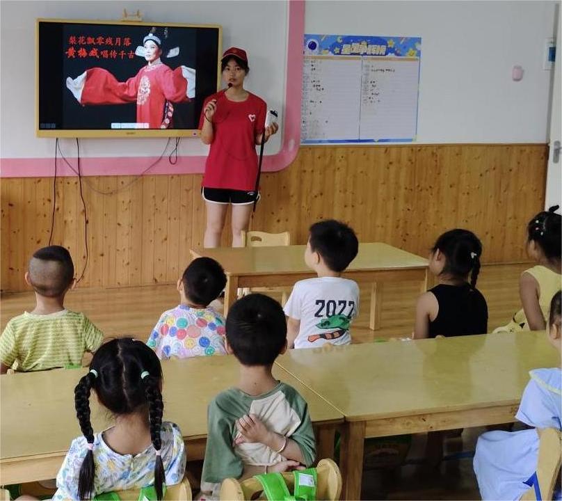 欣赏戏曲之美,感受黄梅古韵8月2日上午,实践队员为幼儿园小朋友们播放黄梅戏片段,包括《女驸马》、《天仙配》、《打猪草》等经典曲目,随着戏曲的腔调,孩子们不自觉的跟随哼唱,对于其中的名句,甚至能够清晰地跟唱。此外实践队员还向孩子们简短介绍了戏曲的背景故事,孩子们被《天仙配》中董永和七仙女的不畏强权,勇敢追求爱情的精神打动,也为《女驸马》中主人公不被封建思想束缚,不为世人看法所影响,努力追求自己幸福的品质所感染,希望能了解更多的黄梅戏曲目。实践队员通过寓教于乐的方法,让孩子们对传统黄梅戏曲目产生兴趣。