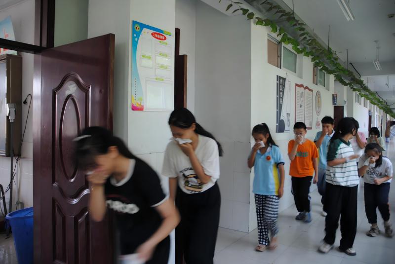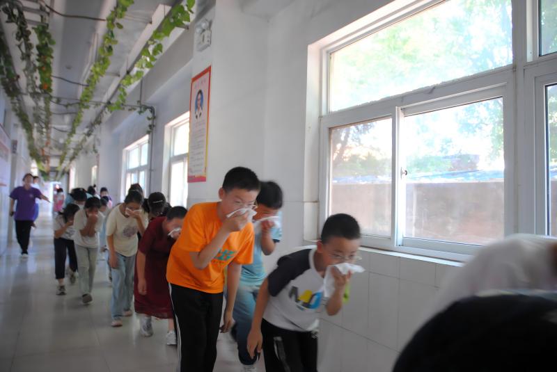 紧急疏散演练开始,警报声长鸣60秒,同时广播下达命令:老师们、同学们,现在教学楼三楼发生火灾,请同学们在老师的组织下按疏散逃生路线安全有序撤离至操场宽阔位置。听到信号后,在教室的教师迅速行动,有条不紊地组织学生撤离。在课堂上的任课老师立即发出指令:“大家分别从前后门疏散,面向疏散方向成两列纵队有序逃生”。教师们在确认教室内无人遗留后,方才最后离开教室。在学生们抵达操场后,各班在指定区域迅速集合,班主任迅速清点人数,并向实践团负责人报告。