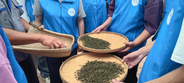 刚采摘的茶叶含水量高,带着股生涩气。制茶的尹经理将其均匀摊在竹匾中,置于阴凉通风处。数小时后,鲜叶颜色稍暗,轻轻一捻便显韧性,轻度萎凋的恰到好处,为后续工序打下基础。