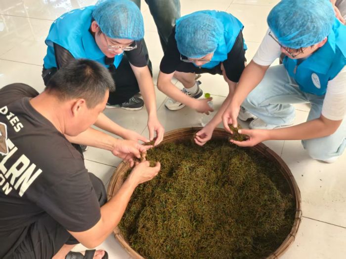 继7月18日体验绿茶采摘与炒制后,实践团7月19日开始着手红茶的制作。来到制茶车间,这里有着严格的卫生条件与消杀要求,同时相较于绿茶的清雅直接,红茶的工艺更为复杂多样,在炒制的基础之上,添入了“发酵”这一精妙的制作工艺。