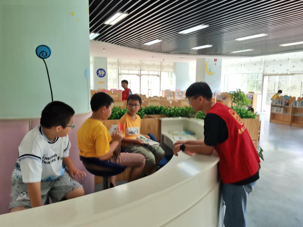 有时会有小朋友找我们帮他找书,部分书因为乱放的原因找起来十分麻烦,几名队员一起找也花费了很长时间,所幸最后找到了。当小朋友们遇到不会的题目的时候,我们不会直接告诉他们答案,而是对这道题进行讲解并教他们怎么做。听到小朋友说谢谢的时候仿佛一天的疲惫都消散了不少。