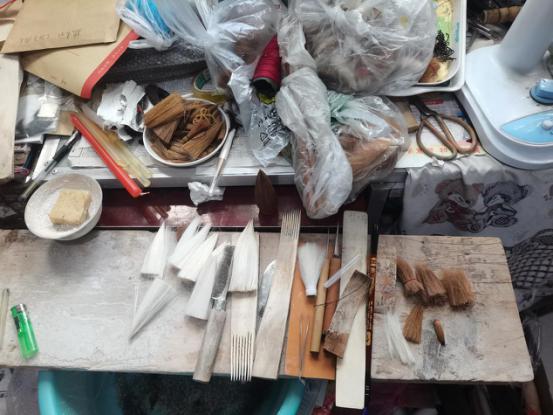 谈话期间,郭老师给我们讲述了毛笔制作的工艺方式,齐笔选料严格。中华齐笔,因其“毛颖之技甲天下”“紫亳之价如金贵”而与浙江湖笔、安徽宜笔、河北衡笔,一同被誉为当代中国的“四大名笔”。与其它三笔不同的是,齐笔采用狼毫材质,选料更为严谨,工艺更为精湛。齐笔工艺繁复,制成需要150多道工序,环节复杂,步步都是高技术、高要求。