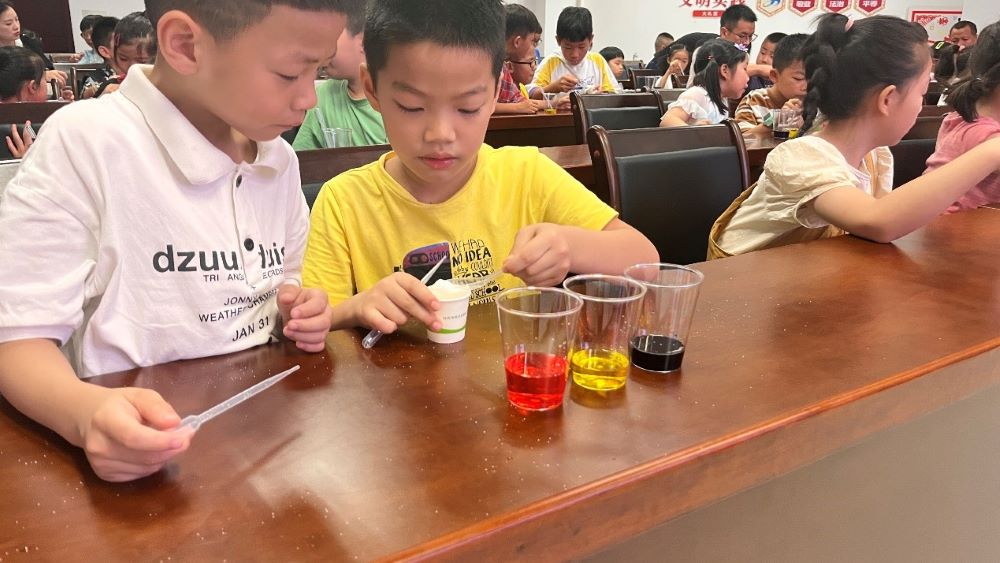 课前分发材料时,我第一次近距离接触到了这群孩子。他们眼里闪着求知的光芒,目不转睛地盯着色素在水杯中滴落、扩散,对接下来将发生的一切充满期待。