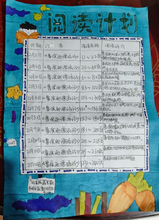 我通过填写自主招募链接与我的弟弟成为对接关系。在他得知此项活动后兴冲冲的拿出《鲁滨逊漂流记》这本书并希望我与他一起阅读,我看到他脸上兴奋的笑容感到十分的欣慰,欣然答应,于是他兴冲冲的拿出纸笔与我一起画起我们的阅读计划表。在参考了众多资料后我们选择了这样一份模版,上面有许多书本,还有一个小男孩抱着书本津津有味的读着,我们都十分喜欢这份读书计划表,所以我们分好工就开始着手画起来了,我负责画和涂色,弟弟负责勾线和确定他的阅读计划。在欢声笑语中我们完成了这一份阅读计划表,并发挥我们的创意将最后一个格子改成了我们的阅读心得,在每完成一次阅读后都写下阅读体会,这样不仅可以加深我们的记忆,也可以锻炼我们的总结能力。