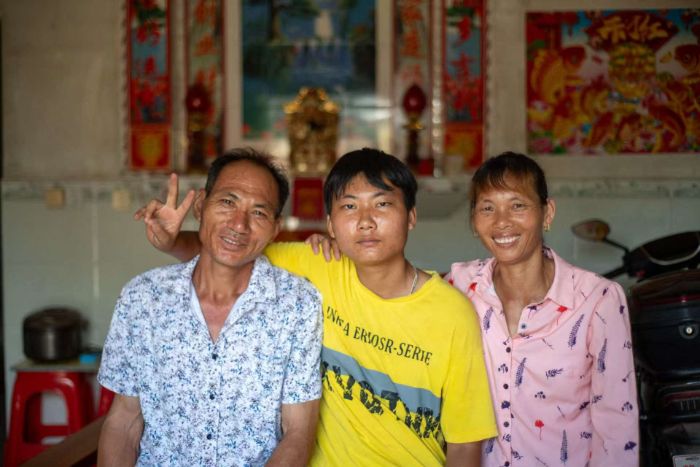 在一家三口的拍摄时,父母盛装出席。父亲换上带着蓝色花纹的白色衬衫,这是干活绝不会穿的颜色;母亲身着粉色衬衫,将黄金耳坠带上,对着镜子将鬓角的碎发梳上。儿子被安在父母中间,他别扭地坐下扯了扯衣领,却在母亲伸手替他整理头发时不自觉地微微低头。“来,看镜头。”妈妈攀着儿子脸上露着大大的微笑,儿子攀着爸爸比耶,爸爸眼角的细纹盛满笑意都封存在这方寸相纸之中。